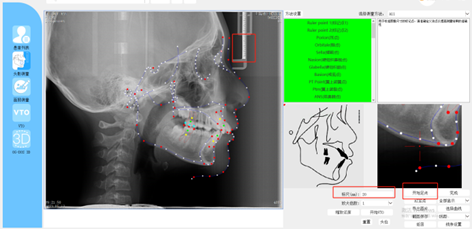 2 | 进入头影测量界面,在线完成头颅定位侧位片的定点、描记 | 15 | 根据受训者标记点与系统内标准答案差异度,自动分析评分;训练环节系统可给出标准定点位 | 10 | |