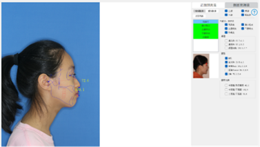 l 面照测量分析(图7):选择虚拟正畸患者侧面及正面的面部照片,进行测量和分析,包括面貌分析和正貌分析。