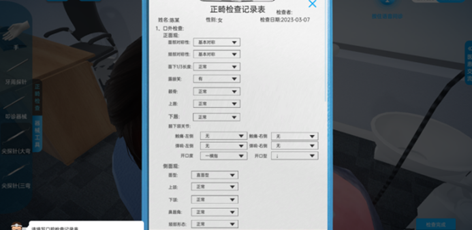 ③病史记录:点击《正畸检查记录表》,进入病例记录界面(图4)。点击各个检查项后方的选项列表,根据检查结果进行勾选。点击完成,回到主界面,后台根据标准答案进行计分。