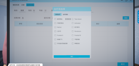 点击按钮,进入“治疗计划”页面(图6);点击添加按钮,在弹框中选择所需正确治疗方案后,点击确定;点击弹出电子病例表之后,点击提交按钮,结束所有操作,回到主页面。