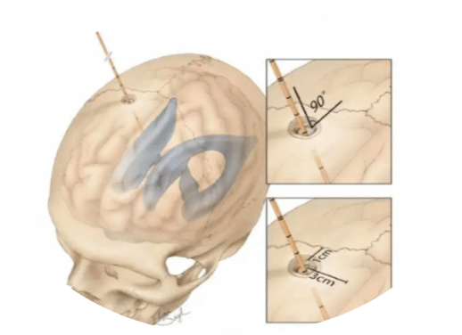 ⑥ 根据选择路径,将引流管脑室端轻柔按照一定方向轻柔准确送入大脑,不同的入路长度不同(此点既考察了学生的解剖知识,又考察了手术技巧及灵活性。)