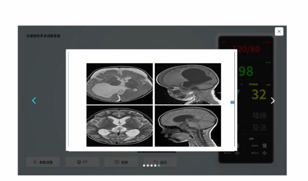 学生可通过鼠标和键盘操作,自由进入到 3D 虚拟的手术室,点开某个患者的病史及影像学,进行影像读片,选择是否需要手术干预。(此点考查脑室引流的适应症、禁忌症。)