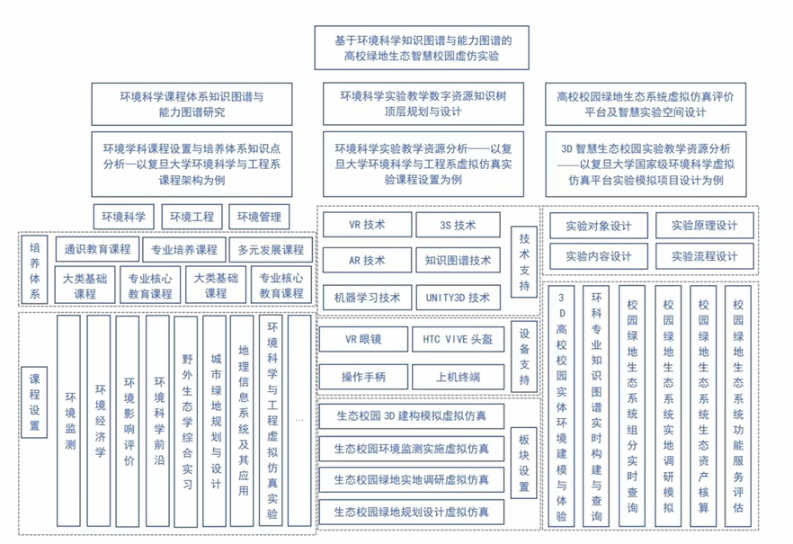 环境科学是一门跨学科的综合性学科,学科信息复杂交互,涉及生态学、化学、物理学等多个领域,该实验课程将充分利用学校整体学科优势,整合环境科学与工程、环境生态学、环境规划与管理、绿地规划与设计、信息技术等相关学科的学科资源,以全球变化研究、城市生态研究、环境遥感与信息技术、虚拟城市技术为支撑点,整合和凝炼环境系现有教学力量,凸现复旦环境学科理工文交叉融合的学科优势,研发高校绿地生态智慧校园虚拟仿真实验教学平台,在注重培养学生“基本知识、基本理论和基本技能”的同时,通过系列的环境科学与工程虚拟仿真实验开展对学生相关综合知识实践应用能力的培养与教学。此外,传统教学方法难以实现这些多维度的知识的全面覆盖与动态整合,而知识图谱与能力图谱技术能够系统地整合与展示这些复杂的知识结构、知识点和实验教学体系,帮助学生更好地理解和掌握相关知识与技能。